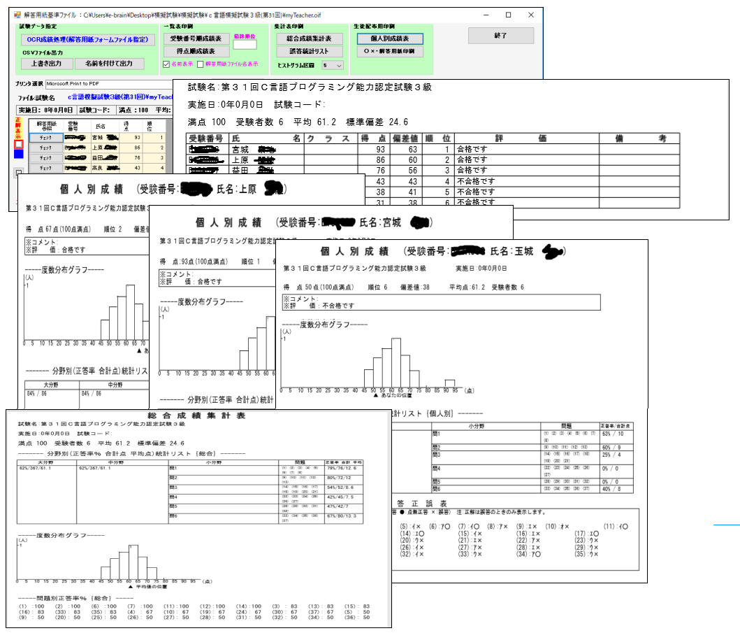4.各種集計表を出力して、受験者に個人別成績表を配り、あっという間に試験処理完了です。